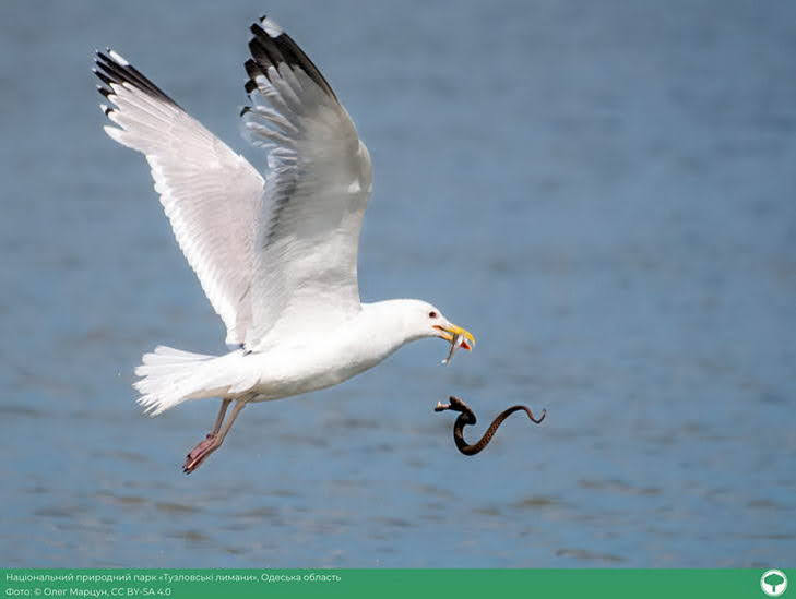 «На озере Малый Сасык, в Тузловских лиманах, я наткнулся на настоящий «ужай шведский стол». Десятки водяных уже то тут, то там следовали с уловом — кто с бычком, кто с камбалой, а кто и с карасиком, как с трофеем года. И именно один такой герой поймал достаточно большого карася. Змей удивления достоин: держит добычу, как чемпион, но проглотил ли он того гиганта – загадка. Нырнул в воду и больше не показался. В память оставил только эту фотографию», — рассказал автор фото Олег Марцун.