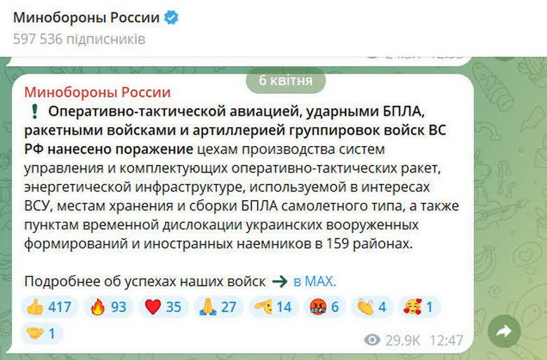 В отчете Минобороны России за 6 апреля сообщается об ударах по «пунктам временной дислокации украинских вооруженных формирований и иностранных наемников». Россия лжет и не признает свои военные преступления о целенаправленных ударах по жилым многоквартирным домам в Одессе с целью убить и ранить как можно больше гражданских.
