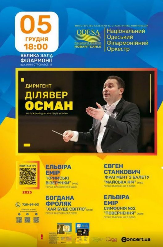 Завтра 5 декабря в 18.00 состоится концерт Национального Одесского филармонического оркестра в Большом зале Одесской филармонии. Одесситов и гостей города приглашают на концерт «Мелодии памяти и света», который перенесет вас в глубокие эмоции, уникальные образы и современные музыкальные переживания. Программа объединяет творчество ведущих украинских композиторов, в произведениях которых звучат темы памяти, культурных корней, духовного возвращения и света. Это будет особый вечер, где музыка будет открывать истории, живущие в нашем общем культурном опыте. Все произведения прозвучат в Одессе впервые! Вечер подарит слушателям новые музыкальные краски и свежие впечатления. За дирижерским пультом — заслуженный деятель искусств Украины Дилявер Осман.