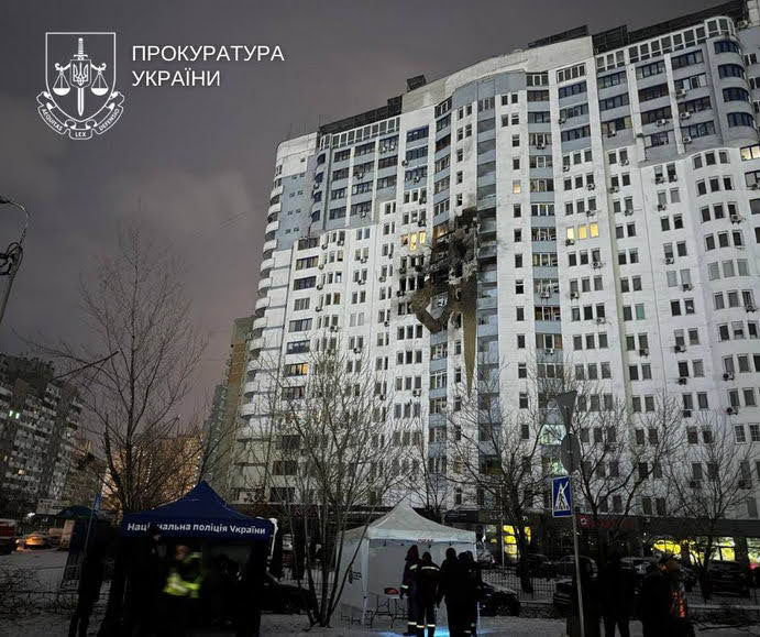 Россия продолжает свои военные преступления – безнаказанно убивает мирных жителей Украины и разрушает жилые дома без всякого присутствия военных целей. Так минувшей ночью 9 января произошла очередная массированная атака по Киеву. Как сообщили в Офисе генерального прокурора, погибли 4 человека, 25 пострадали. Среди погибших — работник скорой помощи, приехавшей спасать раненых и в это время российские террористы ударили повторно «шахедом». Среди раненых медицинские работники, спасатели и полицейские. В Киеве повреждены 19 многоэтажных домов, здание одного из посольств, выбиты окна в детском саду, повреждено трамвайное депо, недостроенная многоэтажка, автомобили, супермаркет, заправочная станция.