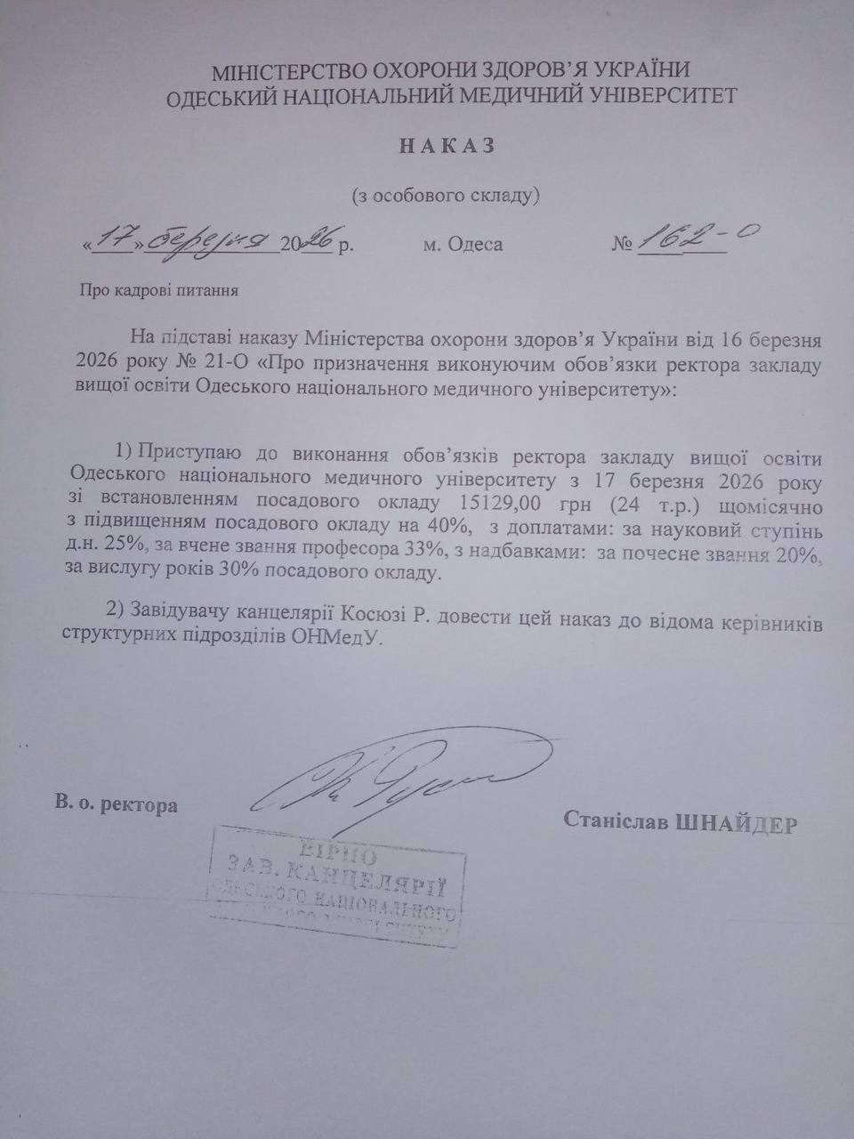 Станіслав Шнайдер призначений тимчасово виконуючим обов'язки ректора одеського Медуніверситету