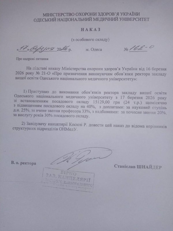 Тимчасово виконуючим обов'язки ректора одеського Медуніверситету став завідувач кафедри стоматології Станіслав Шнайдер.
